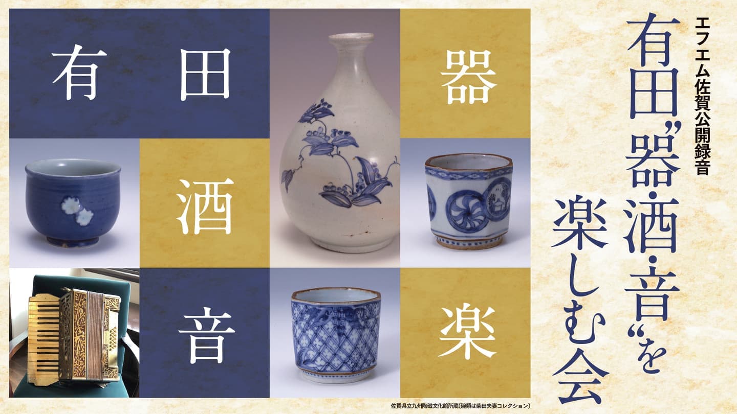 県内の様々な場所で新たな文化シーンの創出にチャレンジする文化芸術祭“LiveS Beyond II”の第6弾として、エフエム佐賀の公開録音「有田“器・酒・音”を楽しむ会」を、九州陶磁文化館開館45周年記念特別企画展「初期伊万里ビッグバン」の会期中に下記のとおり開催します。